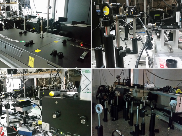 The heart of the setup for the time-resolved spectroscopy is composed of two Ti:Sapphire oscillators (Coherent Mira-HP-Duo) pumped by a high stability Nd:YVO4 DPSS CW laser with an output power of 18 W (Coherent Verdi-V18) . Both lasers provide a high peak power, ultra short pulses with the time duration of ~140 fs or ~1.5 ps in the wavelength range of 700 - 1080 nm with a repetition rate of 76 MHz. For more sophisticated experiments both oscillators can be synchronized to provide pulse trains with well defined time relation and minimal jitter.